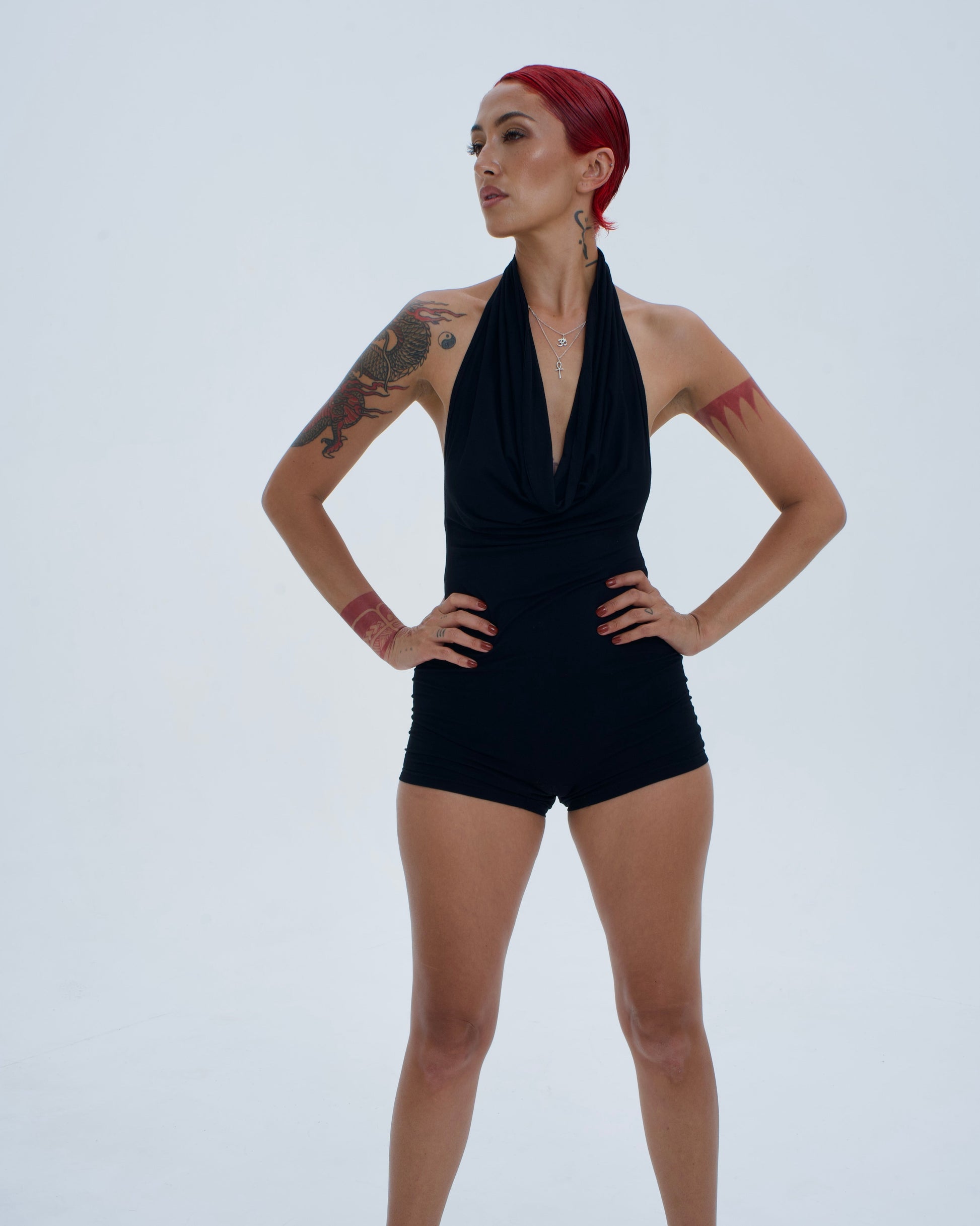 The Venus Jumpsuit takes its cues from Michelle Pfeiffer’s unforgettable glamour in Scarface and the iconic 90s backless dresses that draped like liquid silk. Designed to embody that same sensuality, it flatters every curve with a fluid, body-skimming fit and an open back that feels daring yet wearable. The shorts-style cut lets you bend, dance, and move without ever losing the elegance of a dress, making it the perfect blend of sultry and practical.